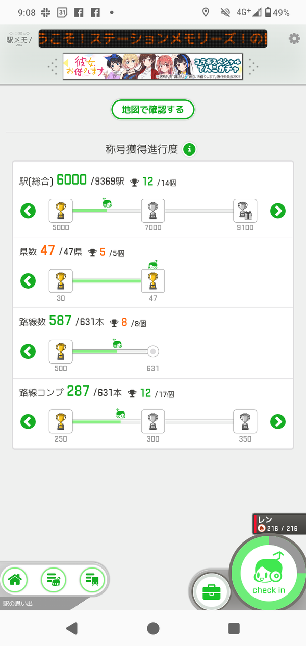 2015 年 11 月 6 日に始めた駅メモですが,2018 年 12 月 8 日に日本全国の駅数の約 1/3である 3000 駅,2019 年 12 月 21 日に 4000 駅,そして 2021 年 8 月 13 日に 5000 駅を達成し,ようやく 2025 年 4 月 9 日に 6000/9369 駅を達成しました.